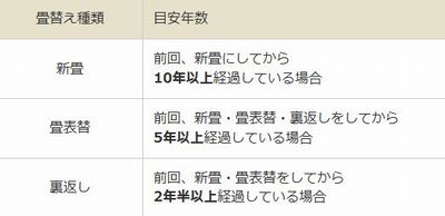 現在の畳を10年以上使っている場合は新畳への取替え、裏返しを行って5年経過している場合は畳表替、2年半経過している場合は裏返しを行います。